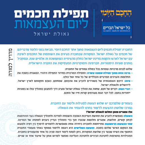 החוברת ’תפילת חכמים ליום העצמאות‘ מתוך אתר ’החכם היומי‘, מביאה בפני הלומד מדבריהם