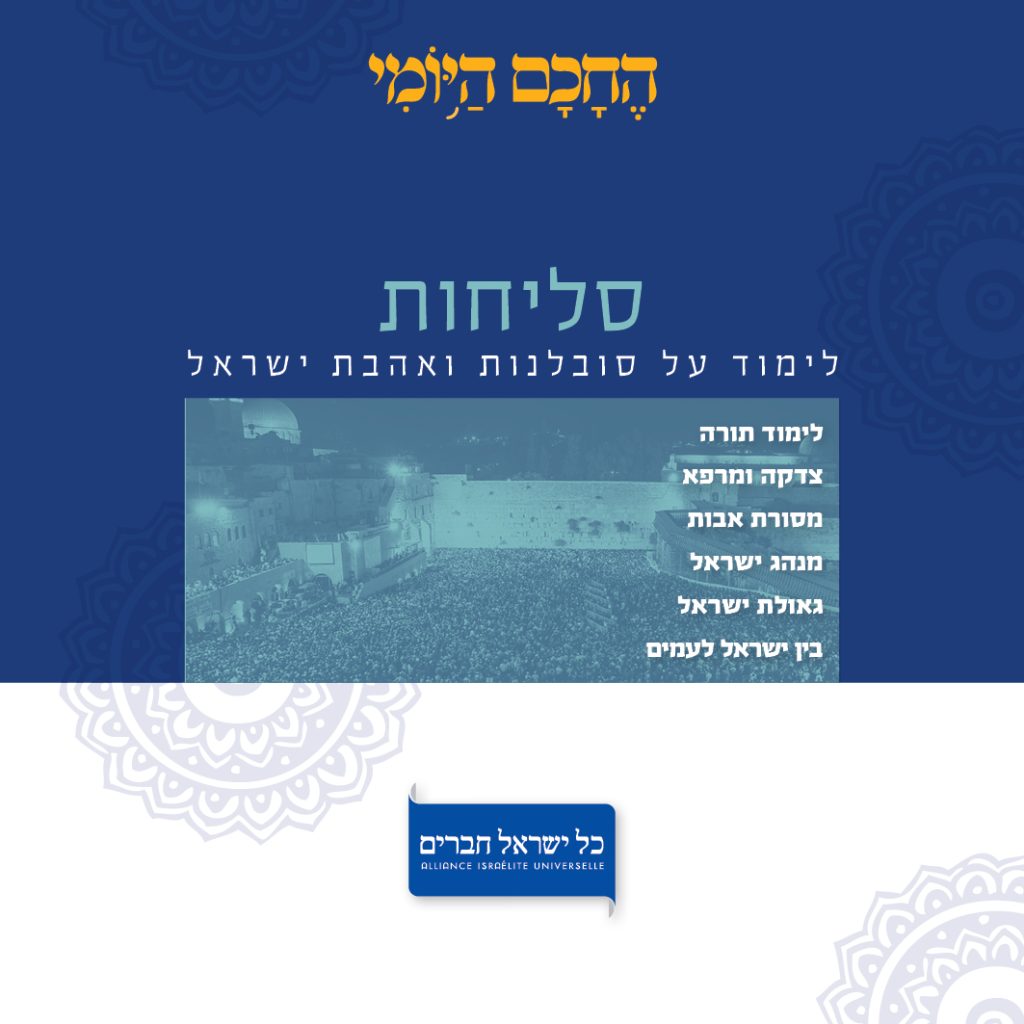 A booklet that combines excerpts from the Piyyutim from the Selichot with the words of the sages from recent generations on the subject of tolerance and love of Israel. Eight familiar Piyyutim, each of which invites further reflection on lines and phrases from the Piyyutim, through Talmud and Zohar studies, alongside commentary by the sages from "The Daily Sage."