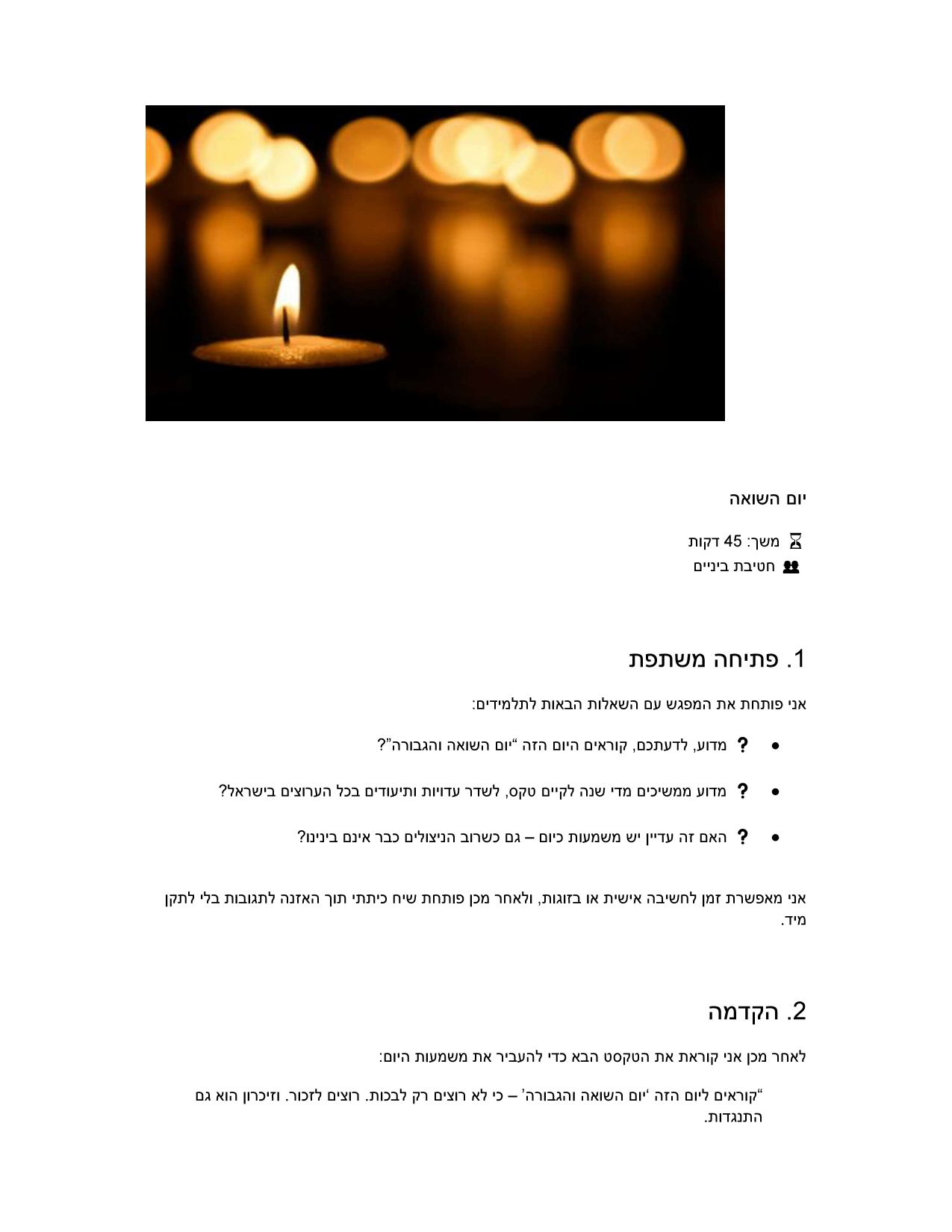 מערך פעילות ליום השואה והגבורה. הפעילות מיועדת לתלמידי חטיבת ביניים עולים מצרפת. במערך פעילות פתיחה, שאלות לדיון, קטע קריאה והצעות לפעילות בקהילה.
